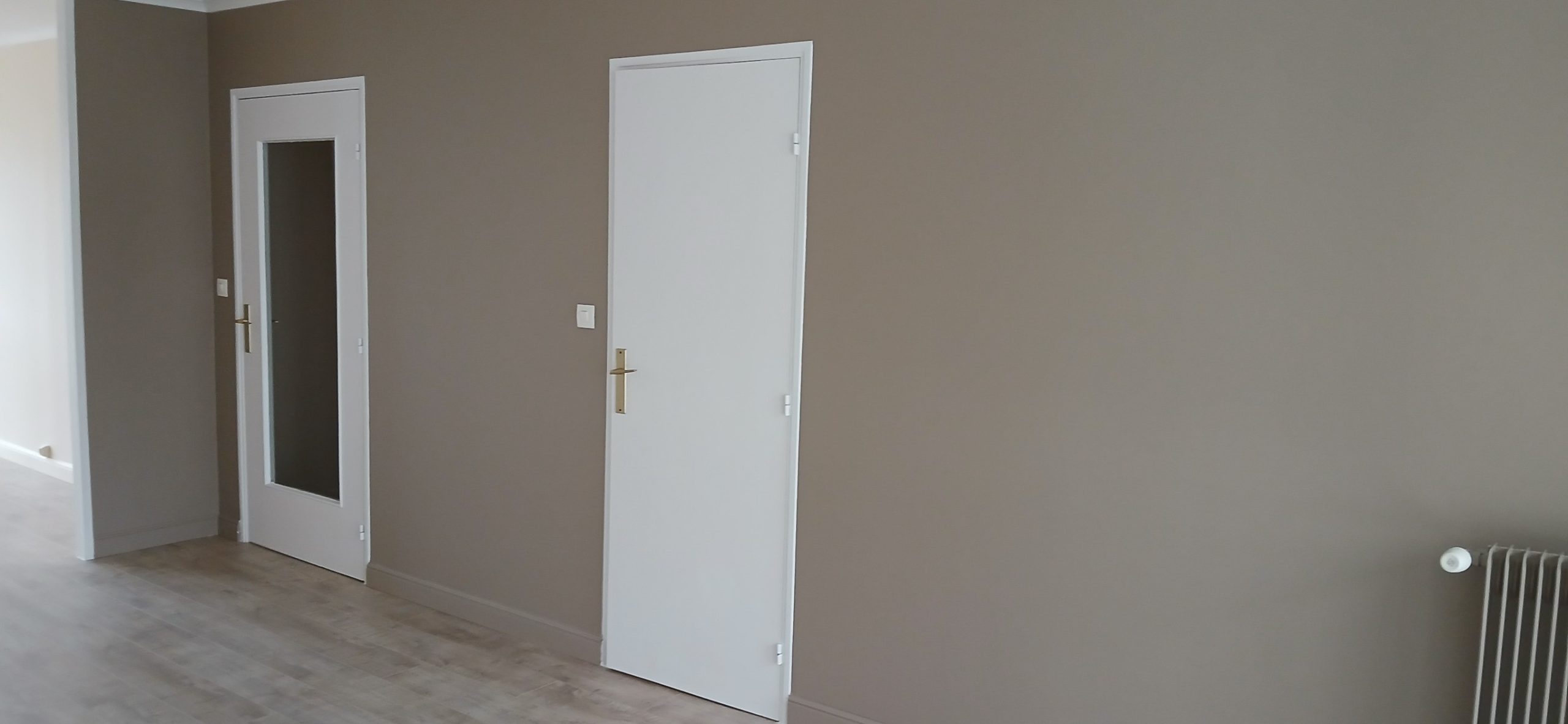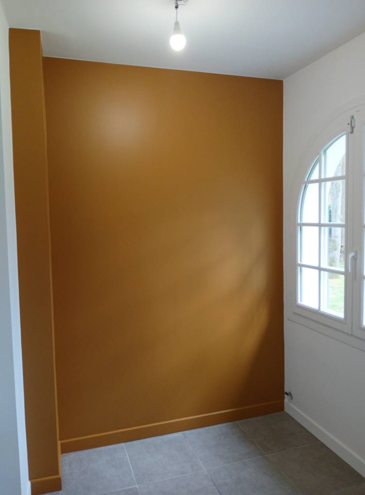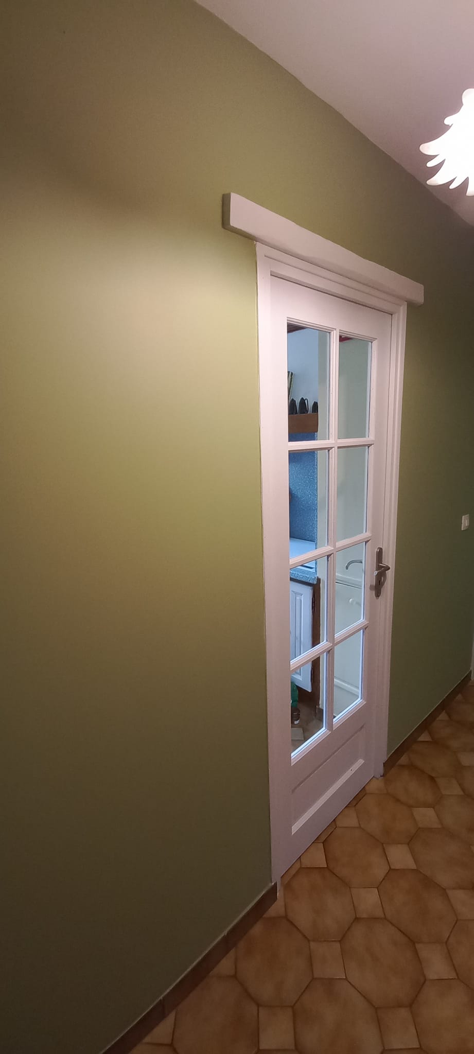 Ici une rénovation d’une entrée et d’un couloir. Depose de la toile de verre, enduit complet, mise en peinture des murs et des portes avec pose d’habillages décoratifs sur ces dernières.