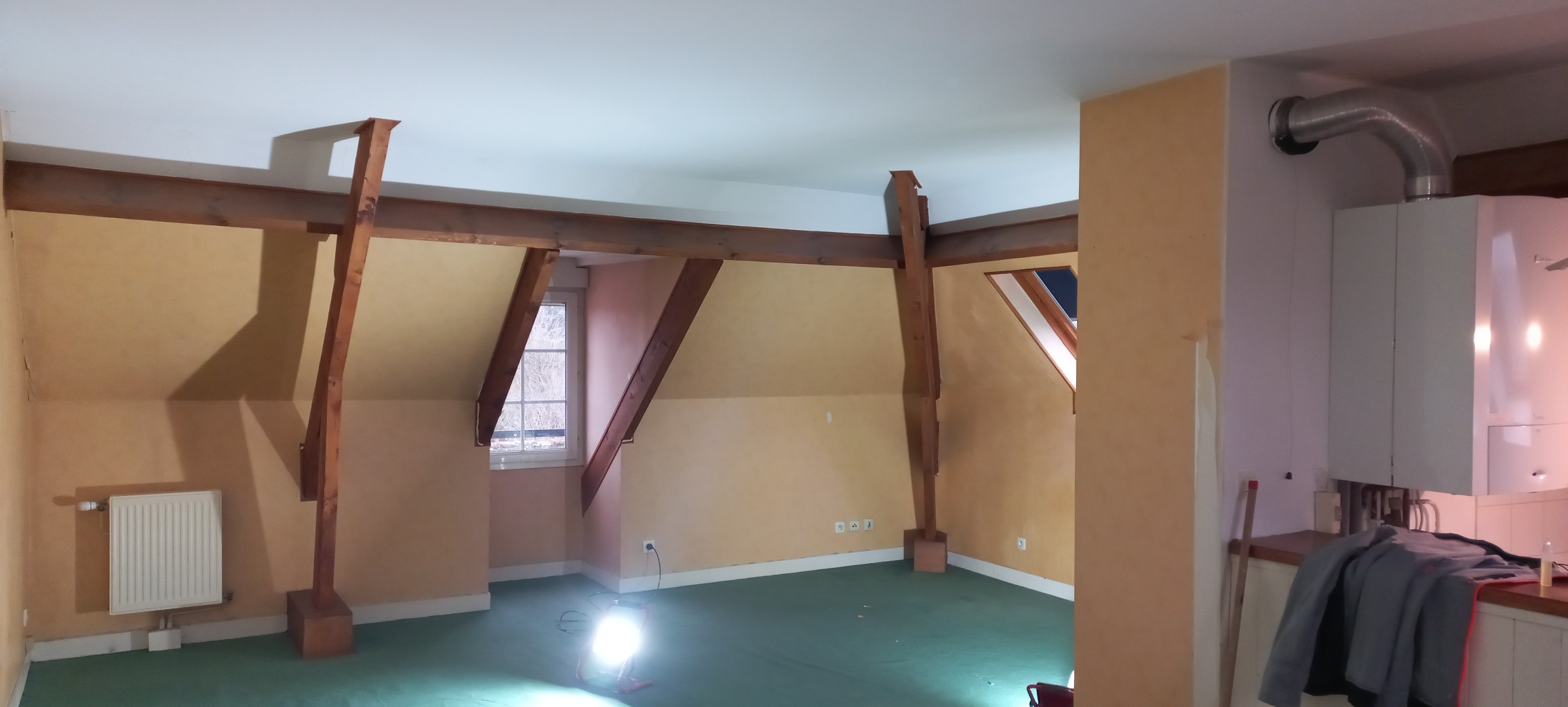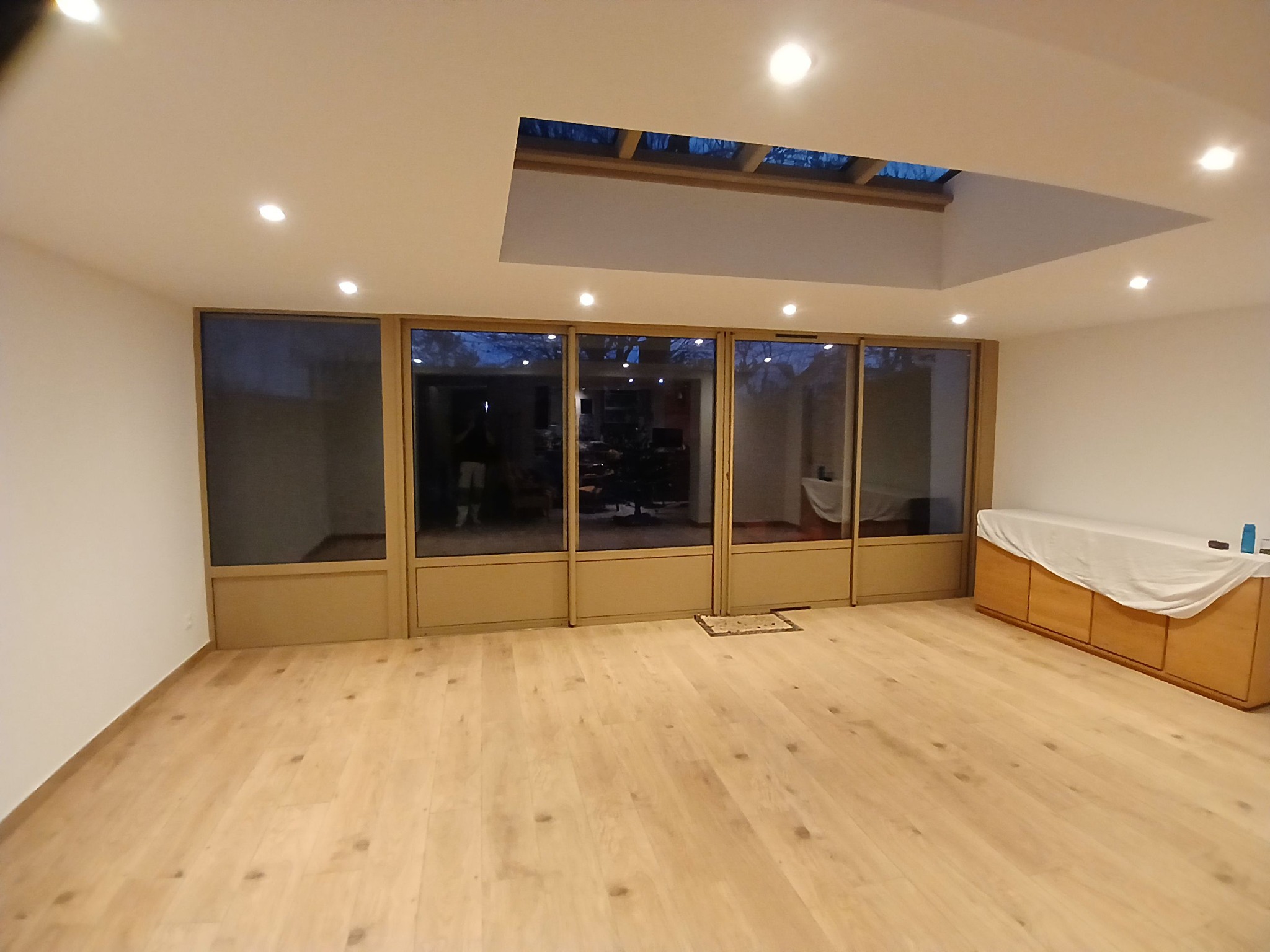 Dépose de l’ancienne moquette, remplacée par un stratifié BERRY ALLOC hydrofuge.