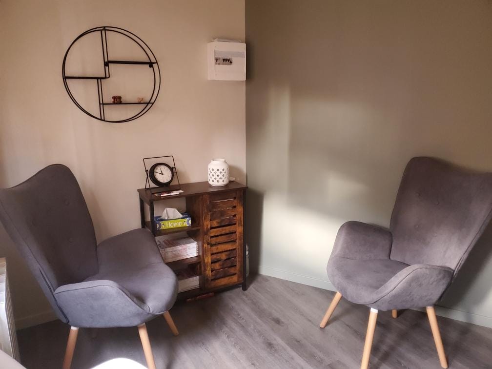 Mise en peinture et pose de sol dans un cabinet de Psychologie Objectif:créer une atmosphère calme et reposante. Le choix des teintes de peinture et du sol est très important Deux tons: « Vert terrarium » et » Blanc marbre » de chez unikalo et un sol LVT effet vieux bois de chez DOURO.